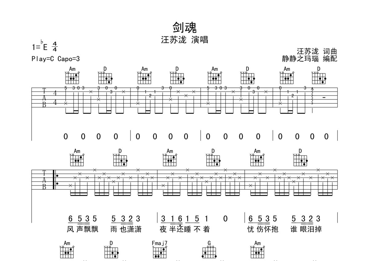 《剑魂》是汪苏泷演唱的一首歌曲,本吉他谱采用的是C调指法编配,这份吉他谱共有三张高清图谱,图谱由 @静待花开 编配上传,图谱使用六线谱编配,包含吉他和弦指法、简谱以及歌词部分,使用这份剑魂吉他谱,可以让你更加方便地掌握这首歌曲的弹唱技巧,快来尝试吧。剑魂C调吉他谱。