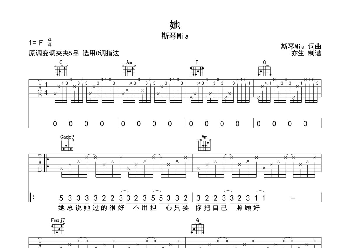 斯琴Mia《她》吉他谱 - C调弹唱六线谱