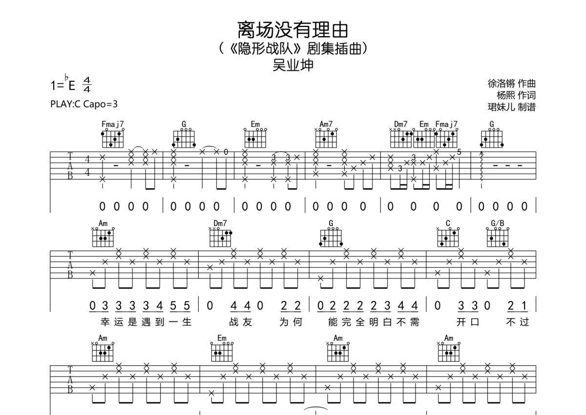 《离场没有理由》是吴业坤演唱的一首歌曲,本吉他谱采用的是C调指法编配,这份吉他谱共有三张高清图谱,图谱由 @珺妹儿 编配上传,图谱使用六线谱编配,包含吉他和弦指法、简谱以及歌词部分,使用这份离场没有理由吉他谱,可以让你更加方便地掌握这首歌曲的弹唱技巧,快来尝试吧。用C调指法编,,弹唱建议变调夹3品,速度85难度较简单,易上手。