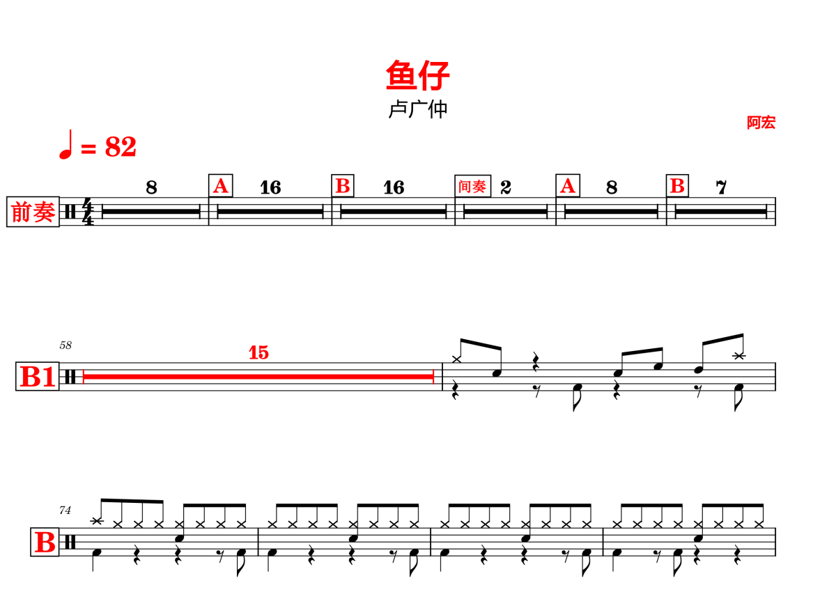 卢广仲《鱼仔》鼓谱 - 架子鼓谱