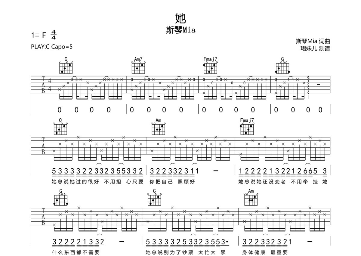 斯琴Mia《她》吉他谱 - C调弹唱六线谱