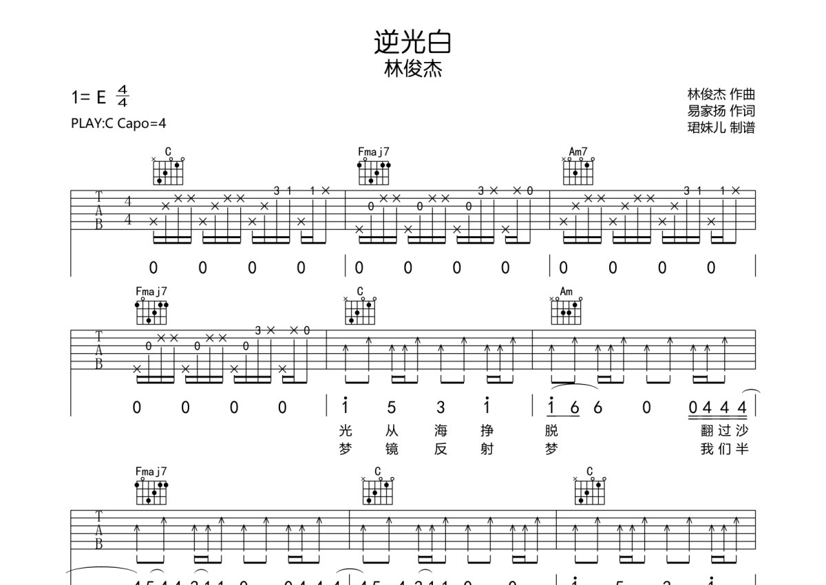 林俊杰《逆光白》吉他谱 - C调弹唱六线谱