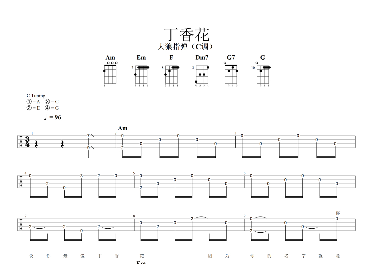 《丁香花》是唐磊演唱的一首歌曲,指弹,本尤克里里谱采用的是C调指法编配,这份尤克里里谱共有三张高清图谱,图谱由 @大狼指弹 编配上传,图谱使用四线谱编配,曲谱配备了相关的音频提供试听,使用这份丁香花尤克里里谱,可以让你更加方便地掌握这首歌曲的演奏技巧,快来尝试吧。《丁香花》尤克里里指弹谱,C调指法。