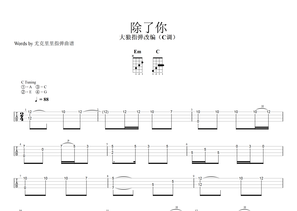 《除了你》是韩宝仪演唱的一首歌曲,指弹,本尤克里里谱采用的是C调指法编配,这份尤克里里谱共有三张高清图谱,图谱由 @大狼指弹 编配上传,图谱使用四线谱编配,曲谱配备了相关的音频提供试听,使用这份除了你尤克里里谱,可以让你更加方便地掌握这首歌曲的演奏技巧,快来尝试吧。《除了你》尤克里里指弹谱,C调指法。