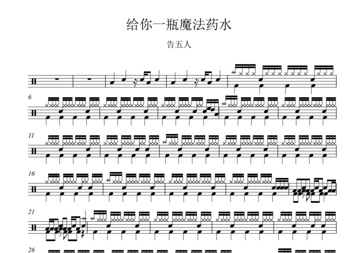 《给你一瓶魔法药水》是告五人演唱的一首歌曲,这份鼓谱共有两张高清图谱,图谱由 @打鼓谱 编配上传,图谱使用五线谱编配,使用这份给你一瓶魔法药水架子鼓谱,你将能够轻松地敲打出这首告五人的给你一瓶魔法药水,快来尝试吧。告五人《给你一瓶魔法药水》。曲谱共2页。