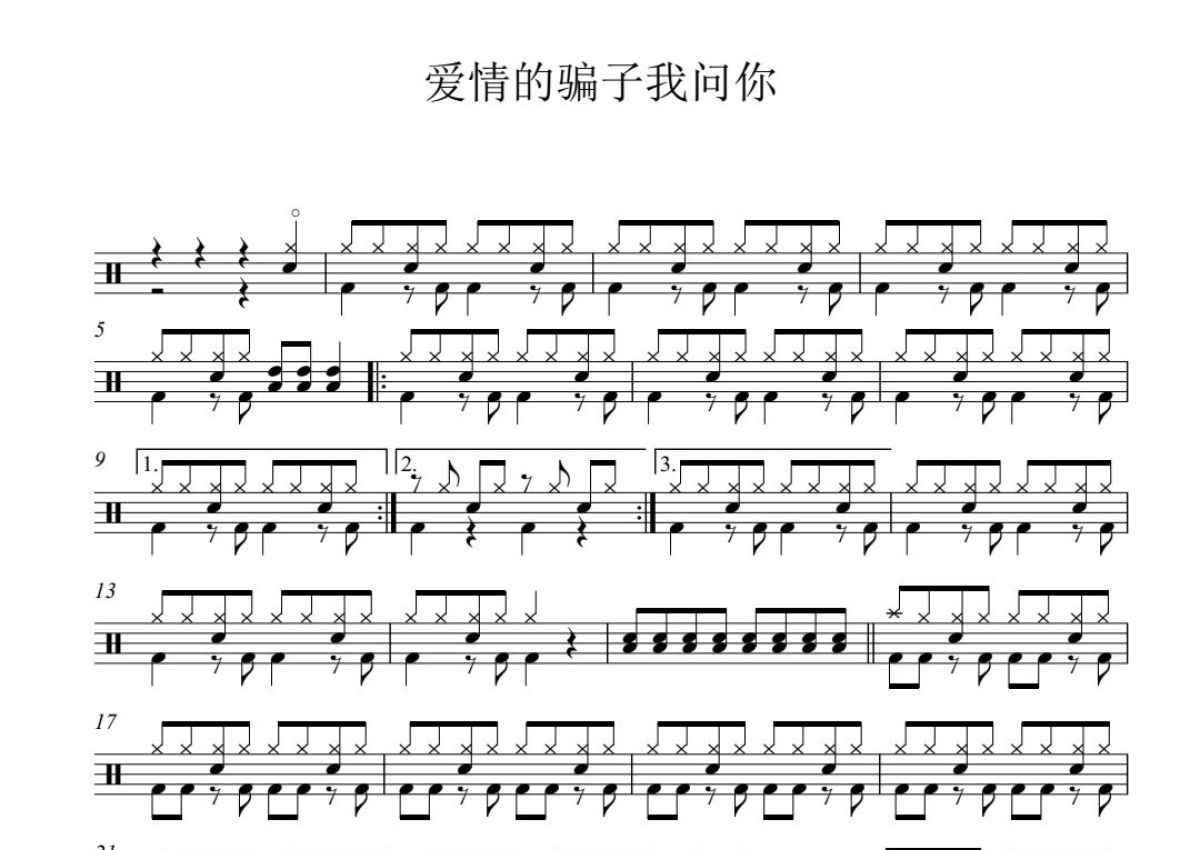 《爱情的骗子我问你》是陈小云演唱的一首歌曲,这份鼓谱共有两张高清图谱,图谱由 @打鼓谱 编配上传,图谱使用五线谱编配,使用这份爱情的骗子我问你架子鼓谱,你将能够轻松地敲打出这首陈小云的爱情的骗子我问你,快来尝试吧。陈小云《爱情的骗子我问你》。曲谱共2页。