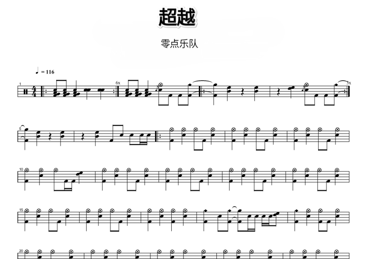《超越》是零点乐队演唱的一首歌曲,这份鼓谱共有一张高清图谱,图谱由 @打鼓谱 编配上传,图谱使用五线谱编配,使用这份超越架子鼓谱,你将能够轻松地敲打出这首零点乐队的超越,快来尝试吧。零点乐队《超越》。