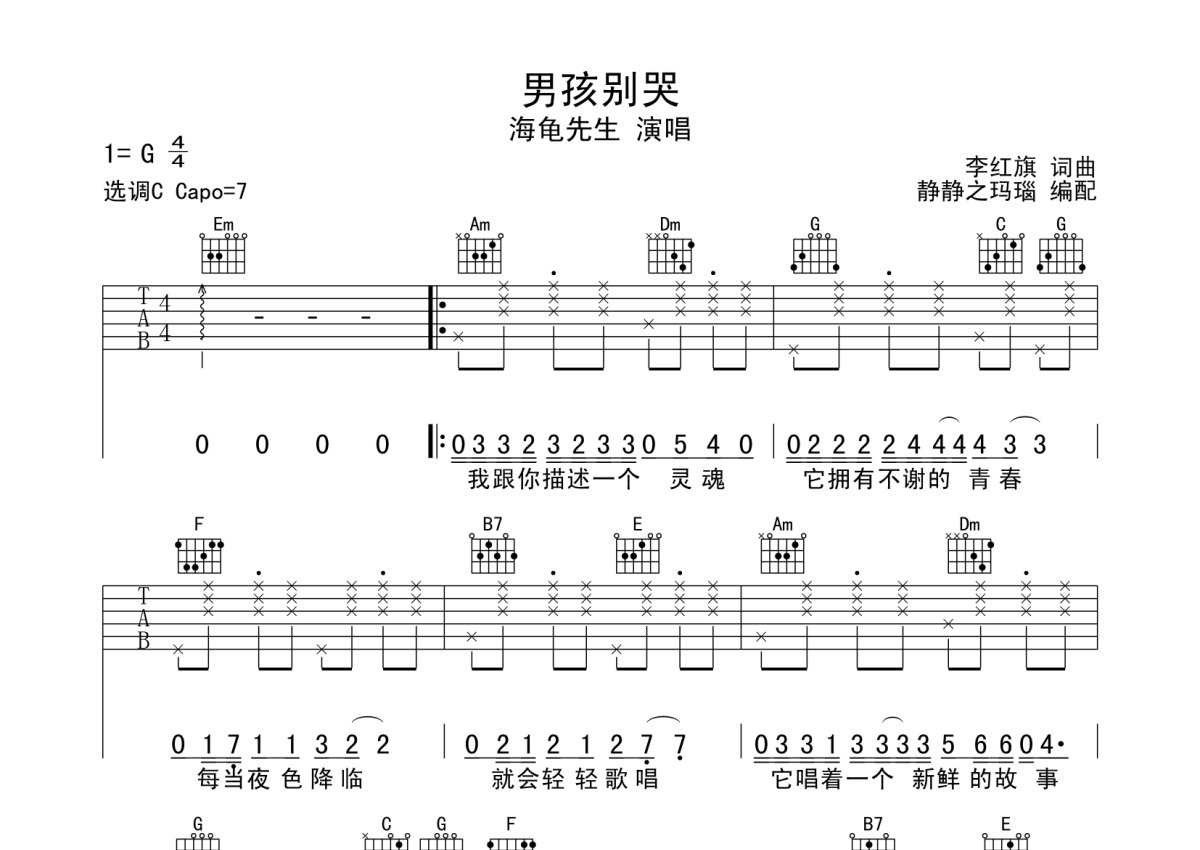 《男孩别哭》是海龟先生演唱的一首歌曲,本吉他谱采用的是C调指法编配,这份吉他谱共有五张高清图谱,图谱由 @静待花开 编配上传,图谱使用六线谱编配,包含吉他和弦指法、简谱以及歌词部分,使用这份男孩别哭吉他谱,可以让你更加方便地掌握这首歌曲的弹唱技巧,快来尝试吧。男孩别哭G调吉他弹唱谱。