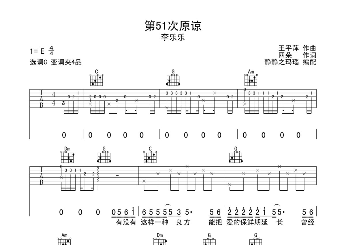 李乐乐《第51次原谅》吉他谱 - C调弹唱六线谱