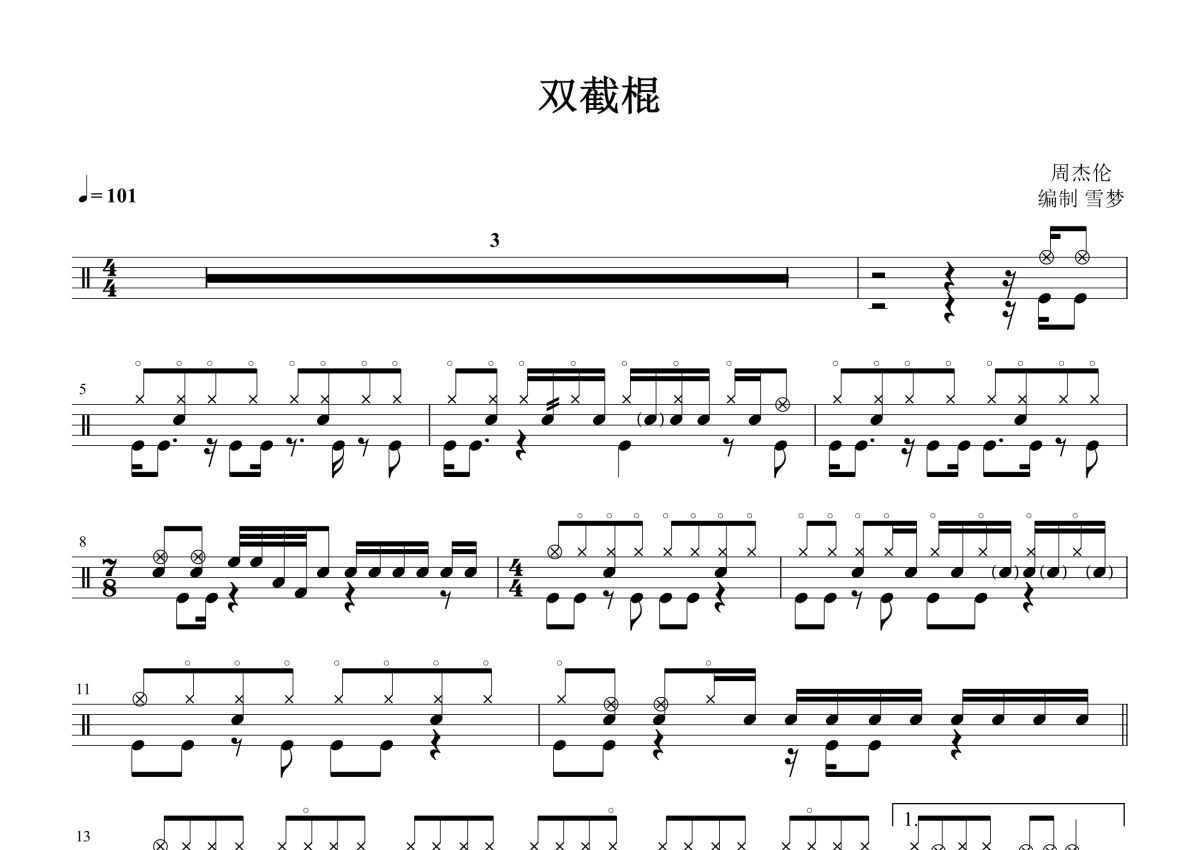 《双截棍》是周杰伦演唱的一首歌曲,这份鼓谱共有三张高清图谱,图谱由 @打鼓谱 编配上传,图谱使用五线谱编配,使用这份双截棍架子鼓谱,你将能够轻松地敲打出这首周杰伦的双截棍,快来尝试吧。《双截棍》是由方文山作词,周杰伦作曲并演唱,收录于专辑《范特西》中。 2011年,《双截棍》被采用于《青蜂侠》电影的片尾曲。 在第13届台湾金曲奖中,钟兴民凭借《双截棍》成为“最佳编曲人奖”。