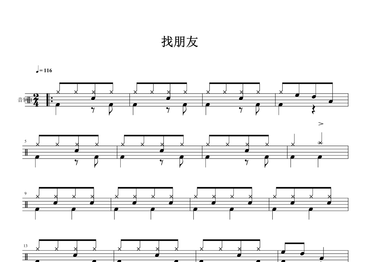 《找朋友》是儿童练习曲演唱的一首歌曲,拍号为2/4拍,歌曲速度为每分钟116拍,这份架子鼓谱共有一张高清图谱,图谱由 @打鼓谱 编配上传,图谱使用五线谱编配,使用这份找朋友架子鼓谱,你将能够轻松地敲打出这首儿童练习曲的找朋友,快来尝试吧。《找朋友》。