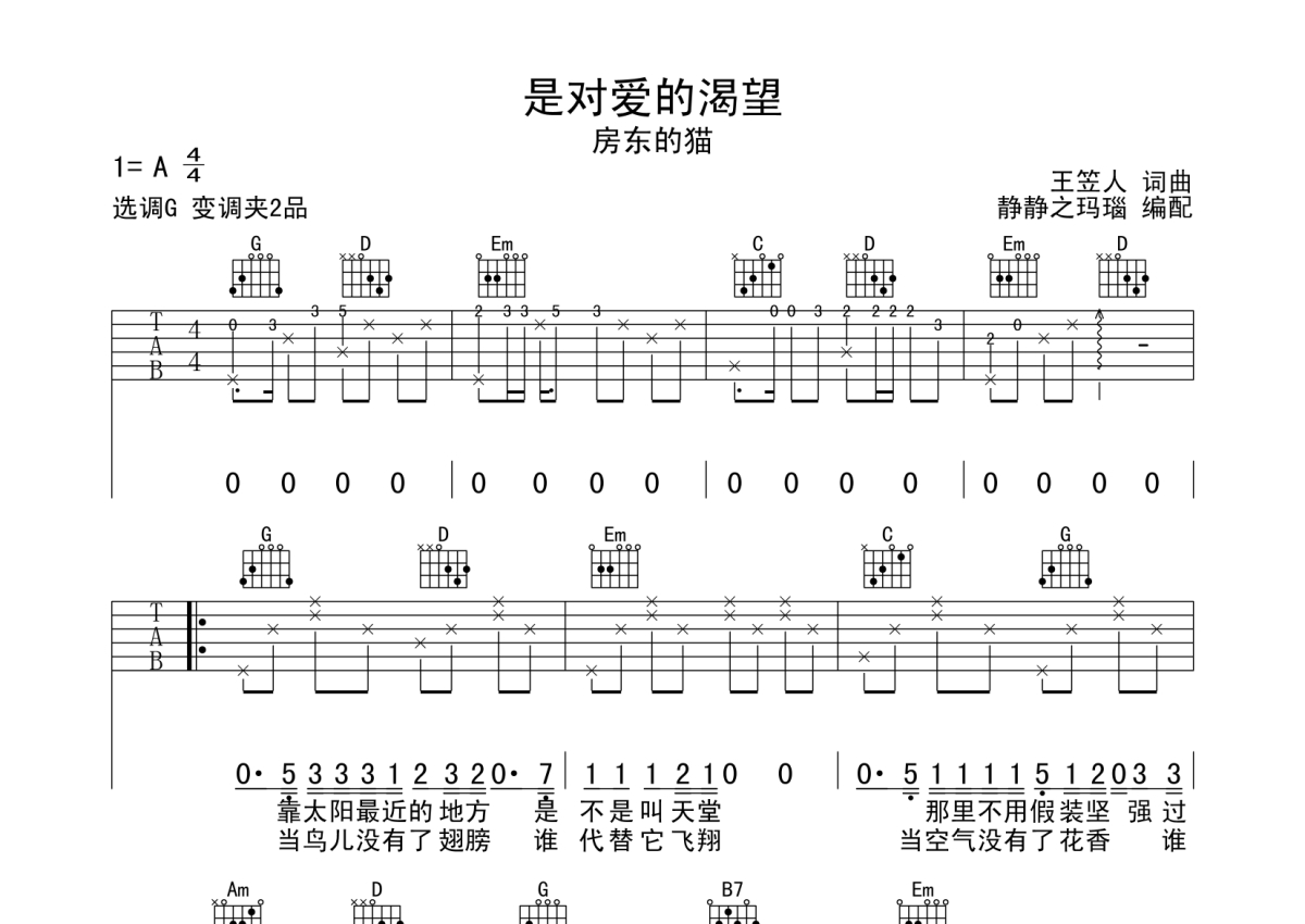 房东的猫《是对爱的渴望》吉他谱 - G调弹唱六线谱