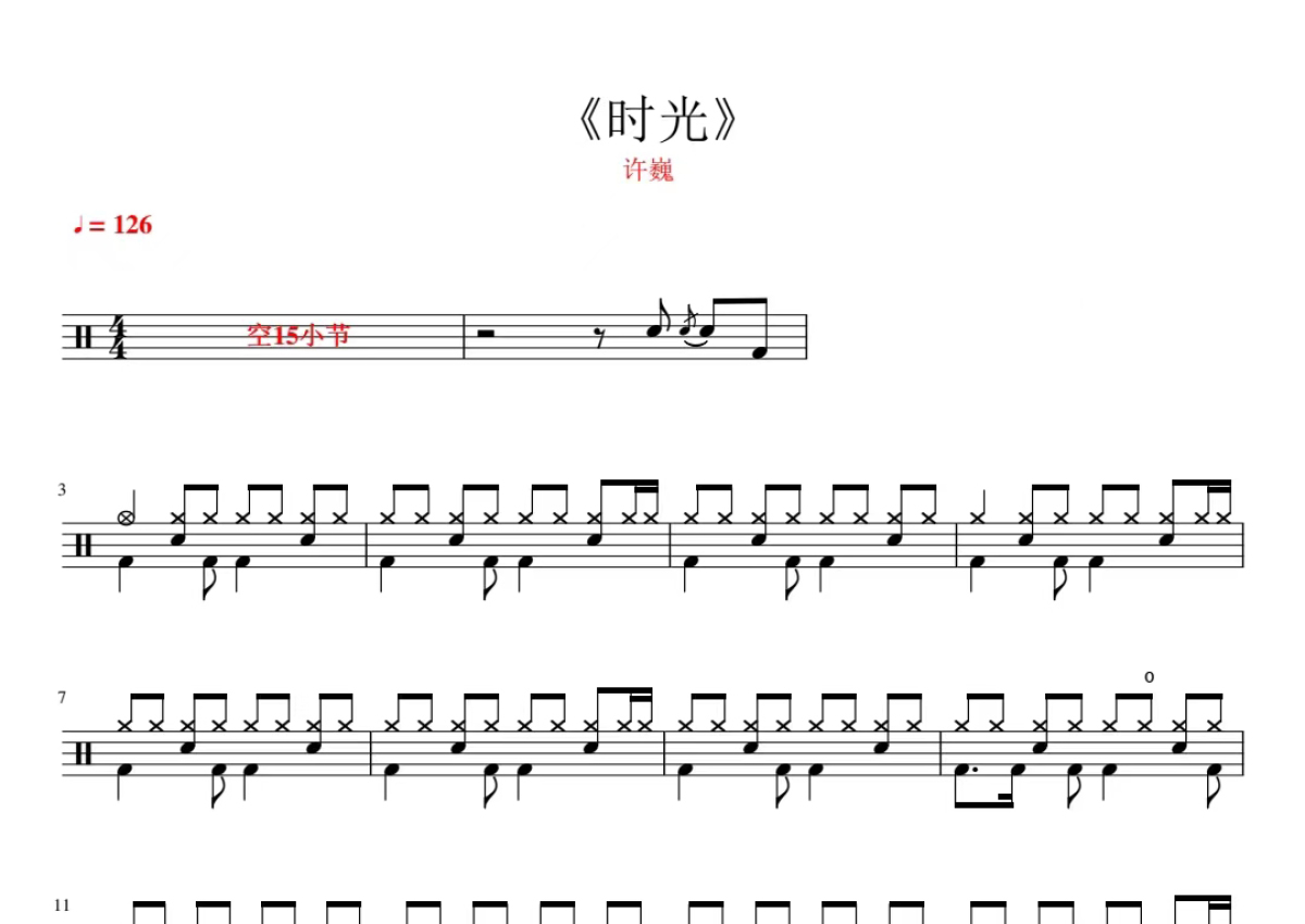 《时光》是许巍演唱的一首歌曲,这份鼓谱共有五张高清图谱,图谱由 @打鼓谱 编配上传,图谱使用五线谱编配,使用这份时光架子鼓谱,你将能够轻松地敲打出这首许巍的时光,快来尝试吧。