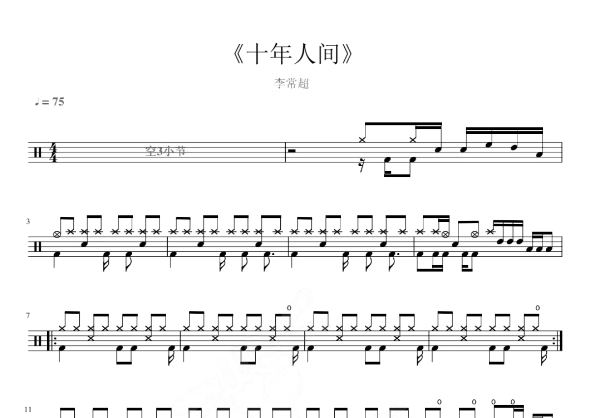 《十年人间》是李常超演唱的一首歌曲,这份鼓谱共有三张高清图谱,图谱由 @打鼓谱 编配上传,图谱使用五线谱编配,使用这份十年人间架子鼓谱,你将能够轻松地敲打出这首李常超的十年人间,快来尝试吧。