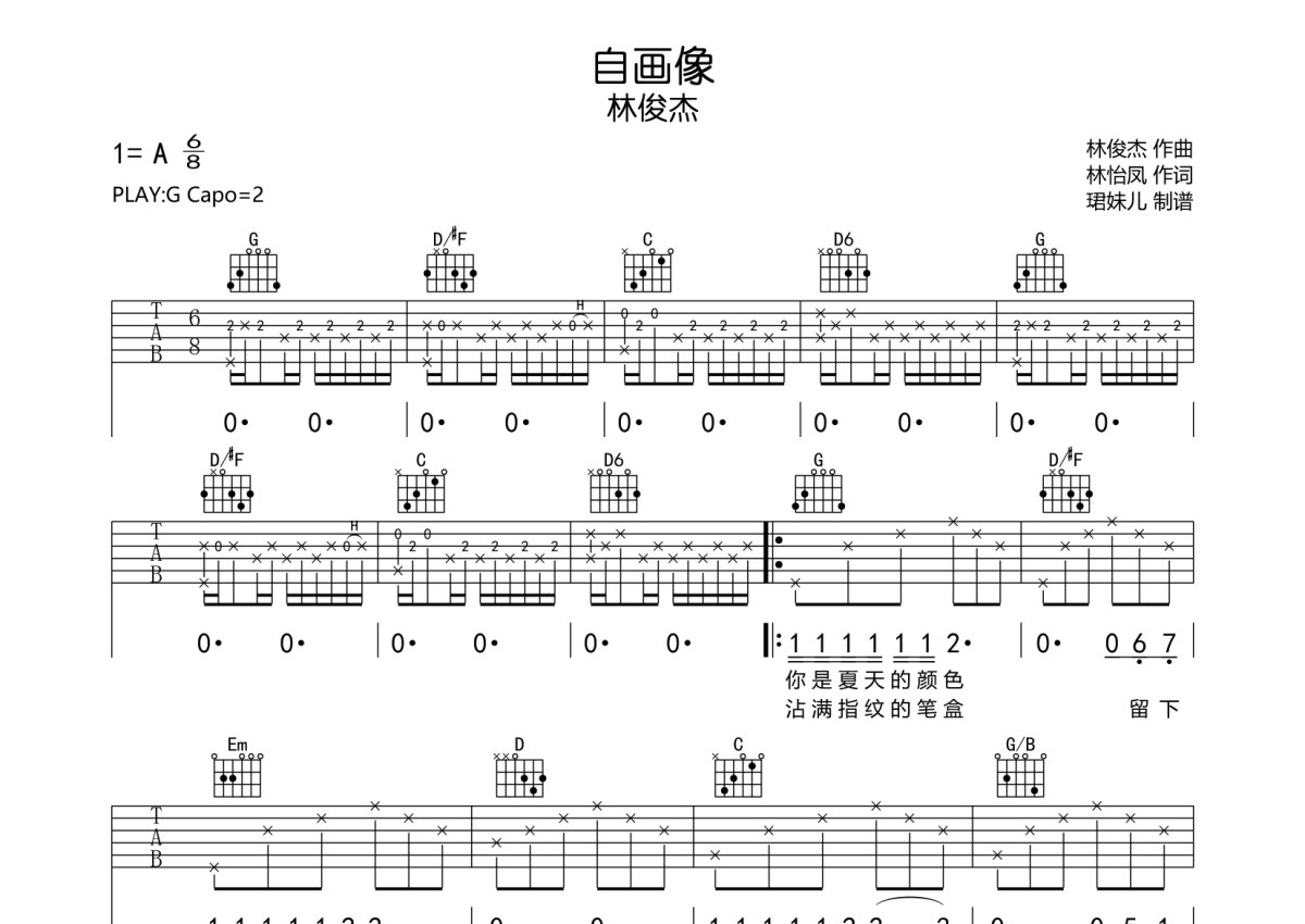 《自画像》是林俊杰演唱的一首歌曲,本吉他谱采用的是G调指法编配,这份吉他谱共有两张高清图谱,图谱由 @珺妹儿 编配上传,图谱使用六线谱编配,包含吉他和弦指法、简谱以及歌词部分,使用这份自画像吉他谱,可以让你更加方便地掌握这首歌曲的弹唱技巧,快来尝试吧。用G调指法编,弹唱建议变调夹2品,速度55难度较简单,易上手。