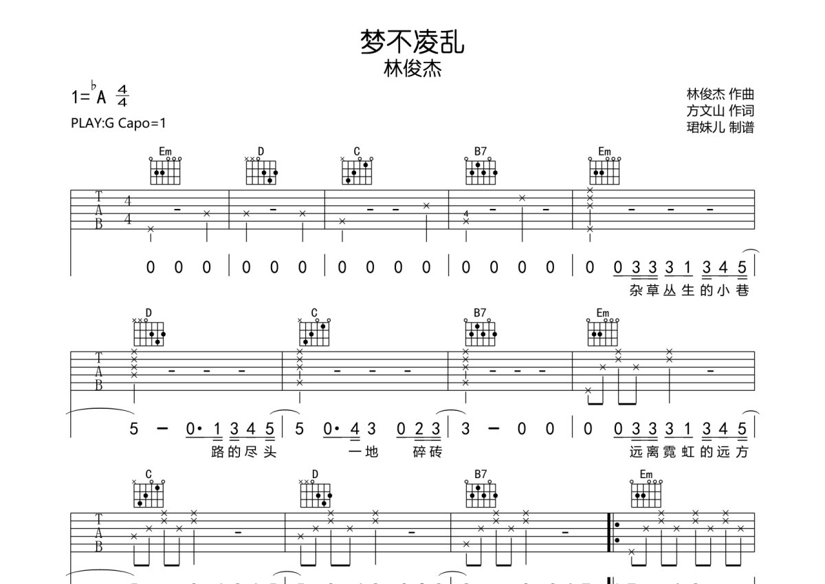 林俊杰《梦不凌乱》吉他谱 - G调弹唱六线谱