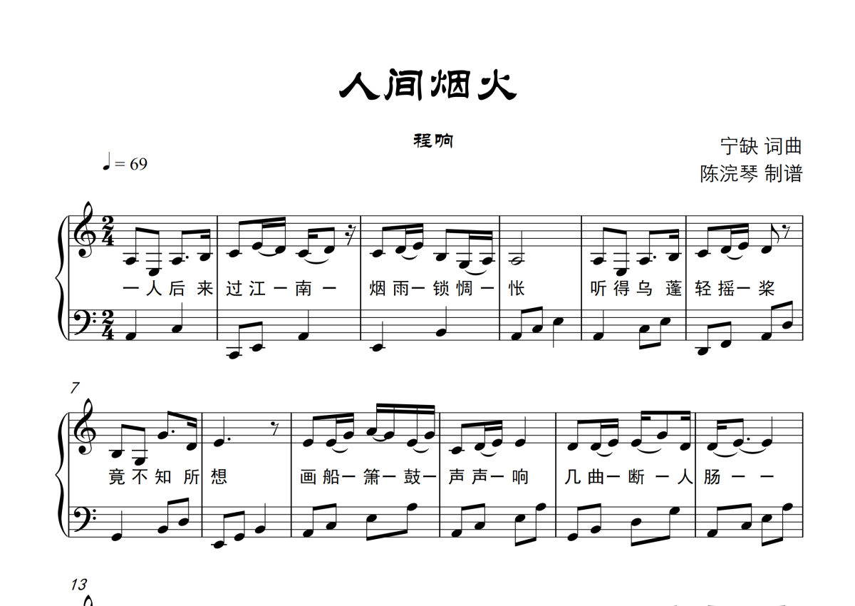 《人间烟火》是程响演唱的一首歌曲,这份钢琴谱共有三张高清图谱,图谱由 @月隐云先知 编配上传,曲谱配备了相关的音频提供试听,使用这份人间烟火钢琴谱,可以让你更加方便地掌握这首歌曲的演奏技巧,快来尝试吧。