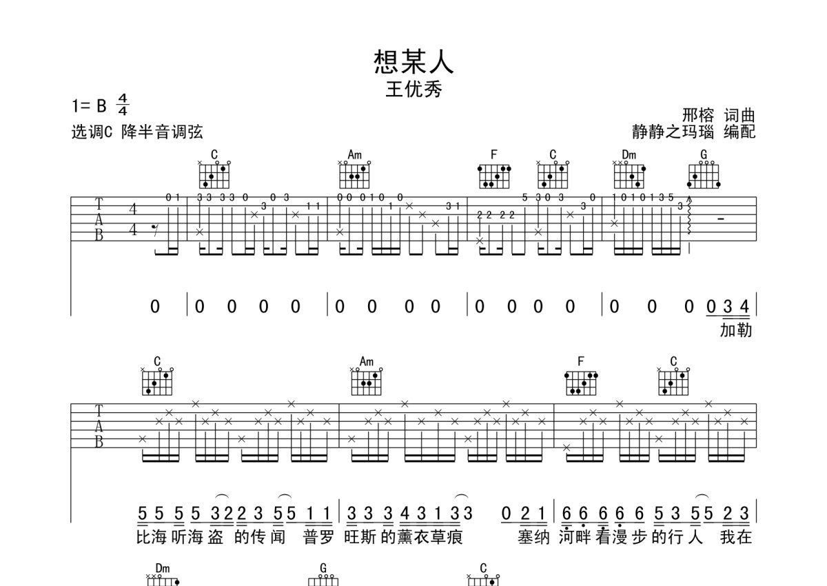《想某人》是王优秀演唱的一首歌曲,本吉他谱采用的是C调指法编配,这份吉他谱共有两张高清图谱,图谱由 @静待花开 编配上传,图谱使用六线谱编配,包含吉他和弦指法、简谱以及歌词部分,使用这份想某人吉他谱,可以让你更加方便地掌握这首歌曲的弹唱技巧,快来尝试吧。想某人C调吉他谱。