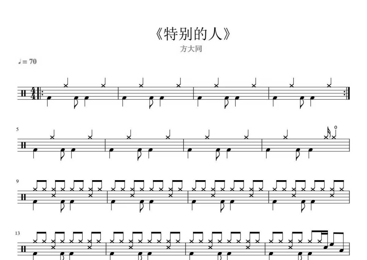 《特别的人》是方大同演唱的一首歌曲,拍号为4/4拍,歌曲速度为每分钟70拍,这份鼓谱共有两张高清图谱,图谱由 @打鼓谱 编配上传,图谱使用五线谱编配,使用这份特别的人架子鼓谱,你将能够轻松地敲打出这首方大同的特别的人,快来尝试吧。