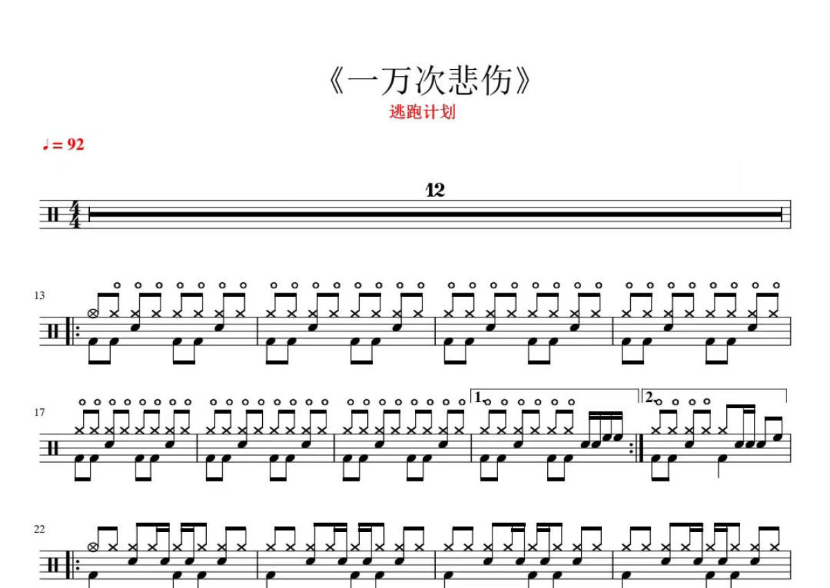 《一万次悲伤》是逃跑计划演唱的一首歌曲,拍号为4/4拍,歌曲速度为每分钟92拍,这份鼓谱共有两张高清图谱,图谱由 @打鼓谱 编配上传,图谱使用五线谱编配,使用这份一万次悲伤架子鼓谱,你将能够轻松地敲打出这首逃跑计划的一万次悲伤,快来尝试吧。