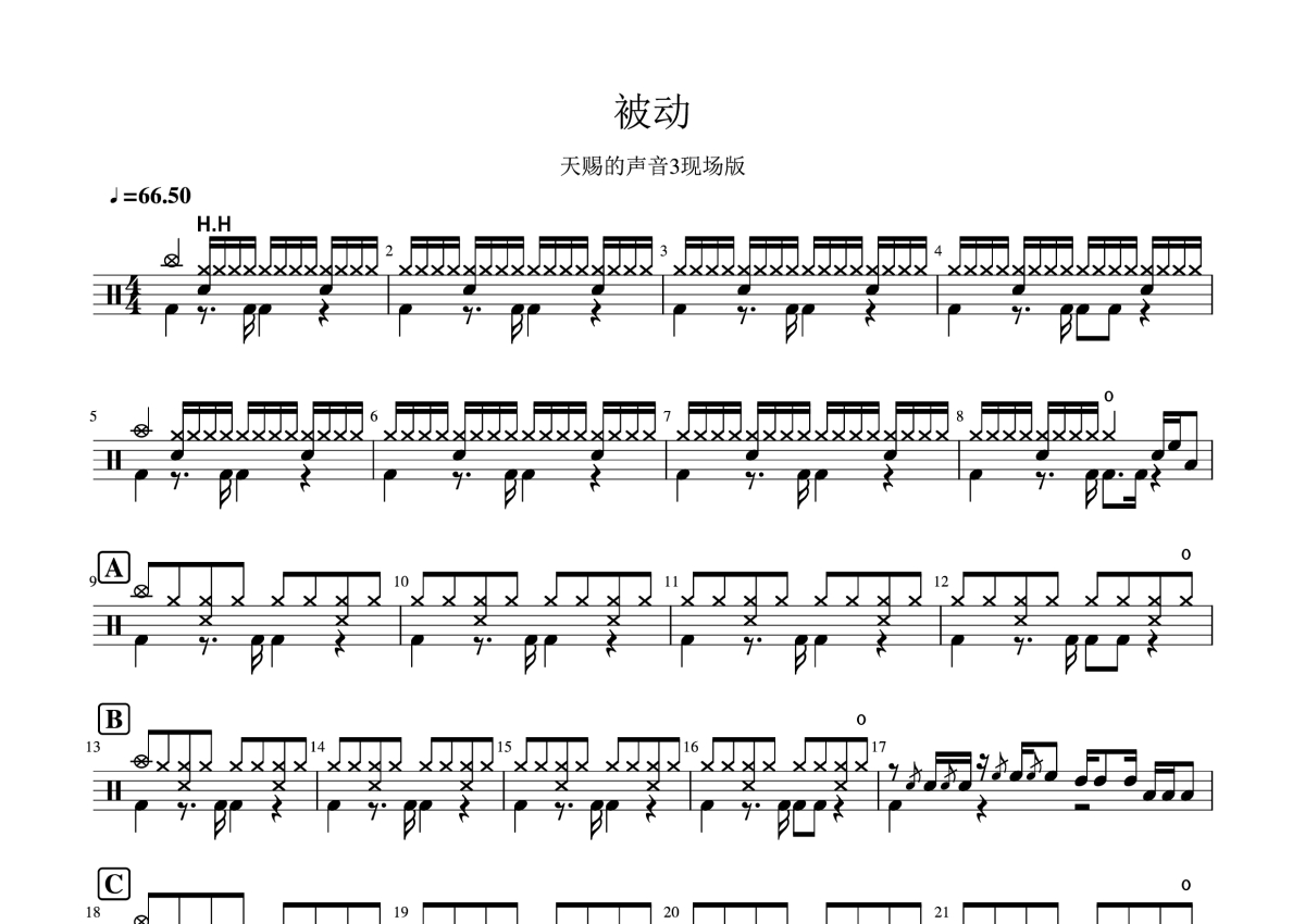 《被动》是吉克隽逸/康姆士乐团演唱的一首歌曲,(Live),拍号为4/4拍,歌曲速度为每分钟66拍,这份鼓谱共有两张高清图谱,图谱由 @打鼓谱 编配上传,图谱使用五线谱编配,使用这份被动架子鼓谱,你将能够轻松地敲打出这首吉克隽逸/康姆士乐团的被动,快来尝试吧。被动(Live) - 吉克隽逸/康姆士乐团 原唱:苏慧伦 词:潘丽玉 曲:伍佰。