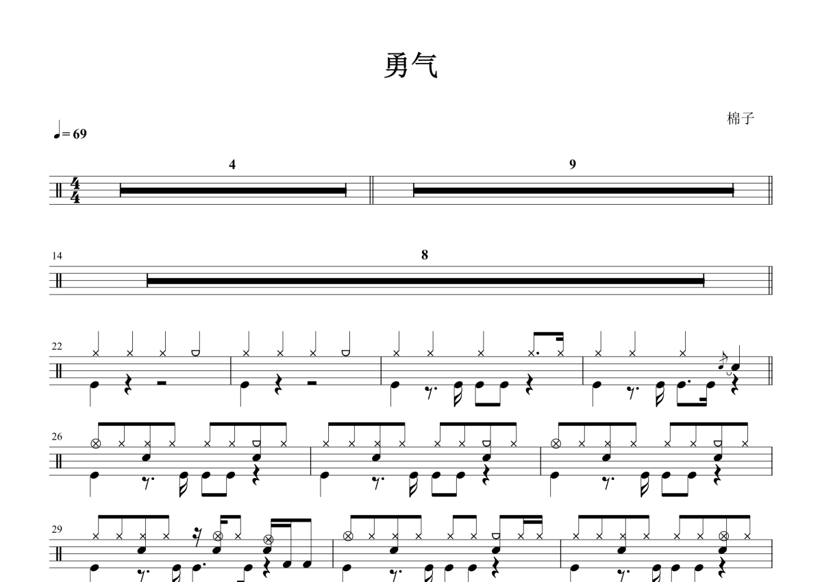《勇气》是棉子演唱的一首歌曲,拍号为4/4拍,歌曲速度为每分钟69拍,这份鼓谱共有两张高清图谱,图谱由 @打鼓谱 编配上传,图谱使用五线谱编配,使用这份勇气架子鼓谱,你将能够轻松地敲打出这首棉子的勇气,快来尝试吧。歌曲《勇气》是华语流行乐女歌手梁静茹演唱的一首疗伤情歌,由光良作曲,瑞业填词,收录于梁静茹2000年8月02日发行的第二张个人专辑《勇气》中;同时这首歌也被选为了古装剧《侠女闯天关》台湾版和都市剧《出水芙蓉》的片尾曲。2005年,这首歌在经典希望之歌网路票选活动中夺得冠军。2007年,梁静茹在“风云新人”的考试现场演唱了这首歌来激励新人。本谱为棉子版本。