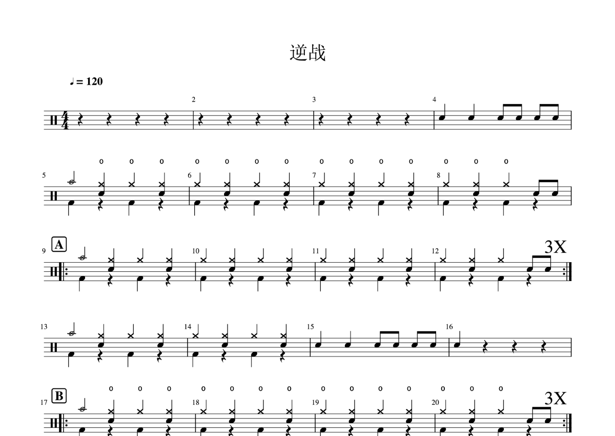 《逆战》是张杰演唱的一首歌曲,初级小朋友版本,拍号为4/4拍,歌曲速度为每分钟120拍,这份鼓谱共有两张高清图谱,图谱由 @打鼓谱 编配上传,图谱使用五线谱编配,使用这份逆战架子鼓谱,你将能够轻松地敲打出这首张杰的逆战,快来尝试吧。《逆战》是为腾讯游戏枪战网游“逆战”演唱的歌曲,由裴育作词,曲世聪作曲编曲,张杰演唱,收录在张杰2012年发行的专辑《One Chance新歌+精选》里,2012年3月21日在腾讯游戏2012年度发布会首唱,MV由周君执导,2012年9月3日首播。