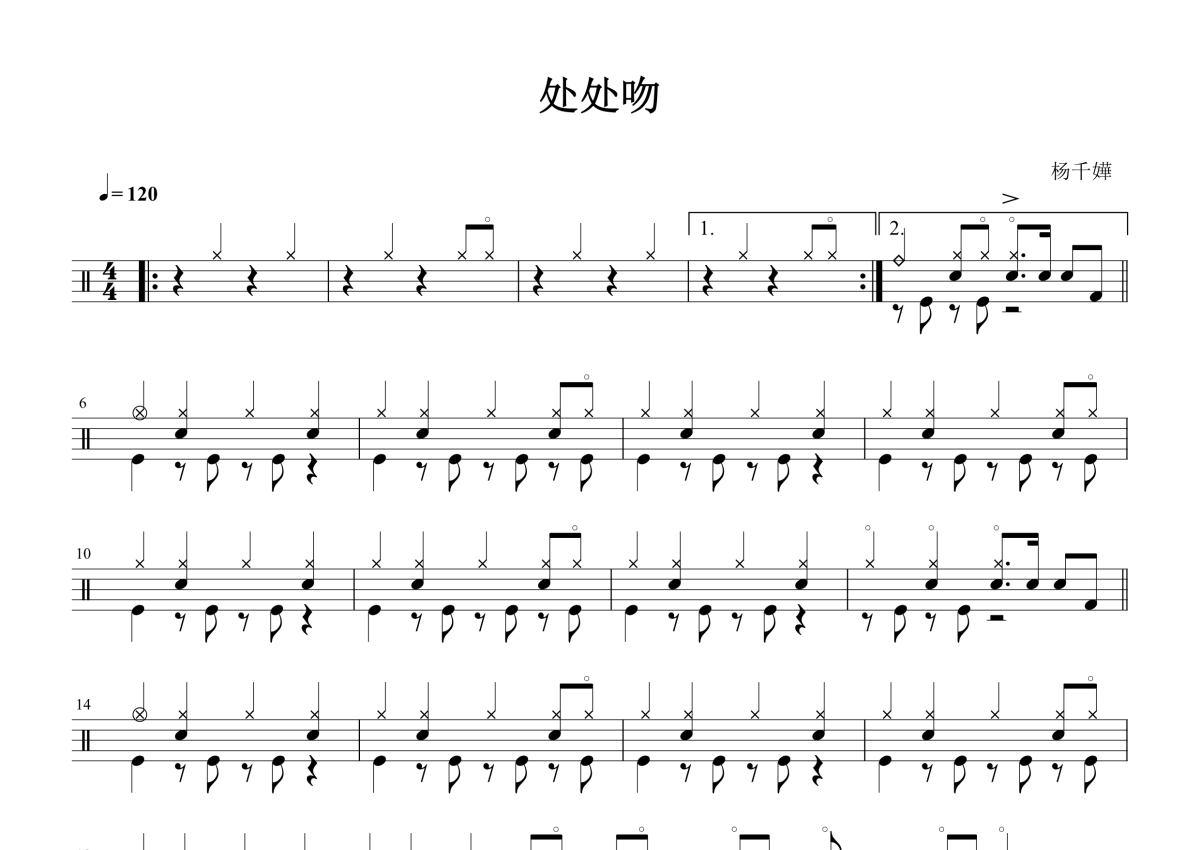 《处处吻》是杨千嬅演唱的一首歌曲,拍号为4/4拍,歌曲速度为每分钟120拍,这份鼓谱共有三张高清图谱,图谱由 @打鼓谱 编配上传,图谱使用五线谱编配,使用这份处处吻架子鼓谱,你将能够轻松地敲打出这首杨千嬅的处处吻,快来尝试吧。粤语歌曲《处处吻》,由杨千嬅演唱,由林夕作词,雷颂德作曲、编曲[,收录于环球唱片 (Universal Music) 旗下的百代唱片 (EMI) 公司2004年6月25日发行的专辑《电光幻影》中。同时还收录于环球唱片 (Universal Music) 旗下的新艺宝唱片(Cinepoly Record.Co.Ltd)公司2007年2月1日发行的专辑《Simply Me》中。