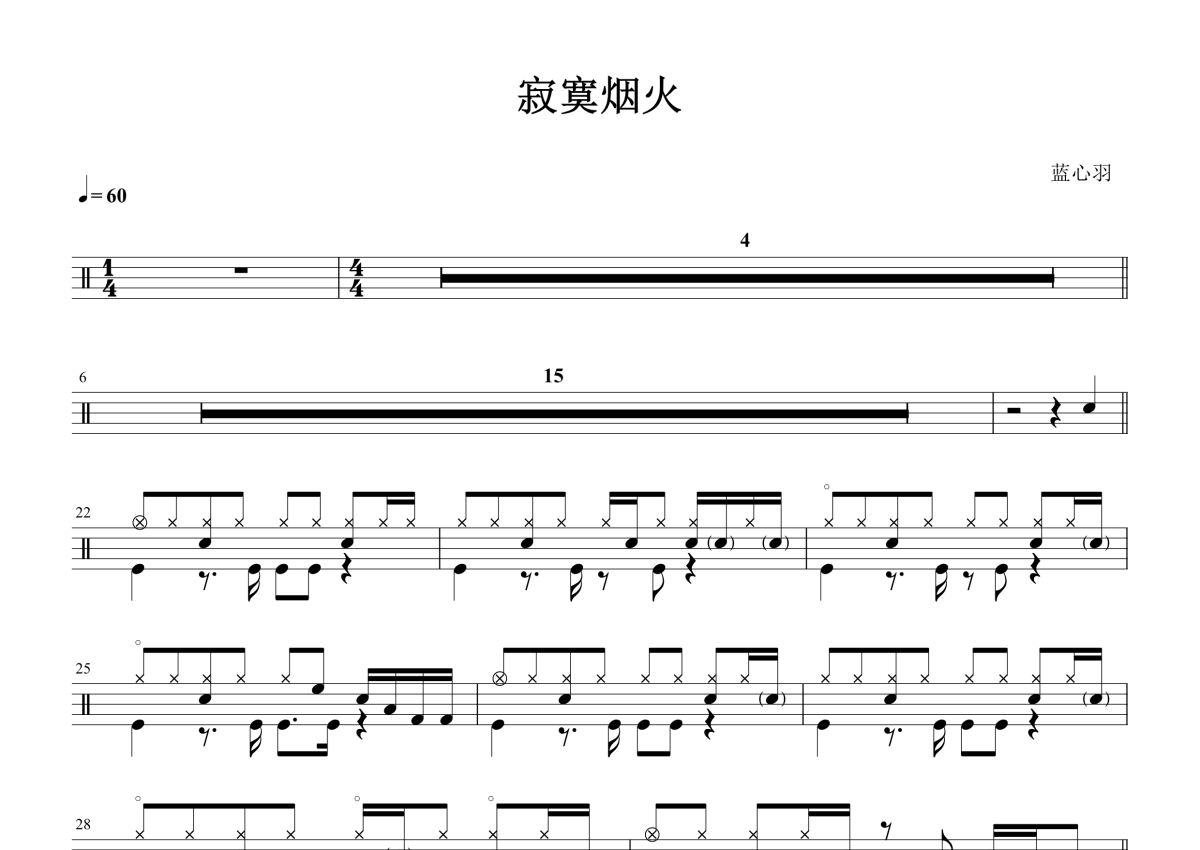 《寂寞烟火》是蓝心羽演唱的一首歌曲,拍号为4/4拍,歌曲速度为每分钟60拍,这份鼓谱共有两张高清图谱,图谱由 @打鼓谱 编配上传,图谱使用五线谱编配,使用这份寂寞烟火架子鼓谱,你将能够轻松地敲打出这首蓝心羽的寂寞烟火,快来尝试吧。《寂寞烟火》是朱婧汐专辑《以梦为马》中的主打歌,亦是专辑制作中最“难产”的一首情歌,旋律和歌词就修改了7、8次,编曲团队换了6组。《寂寞烟火》是一首献给“单身男女”的情歌,朱婧汐想要透过它带给所有寂寞的人最温暖的慰籍,告诉他们: 即使一个人度过热闹节日,大家也并不孤单。