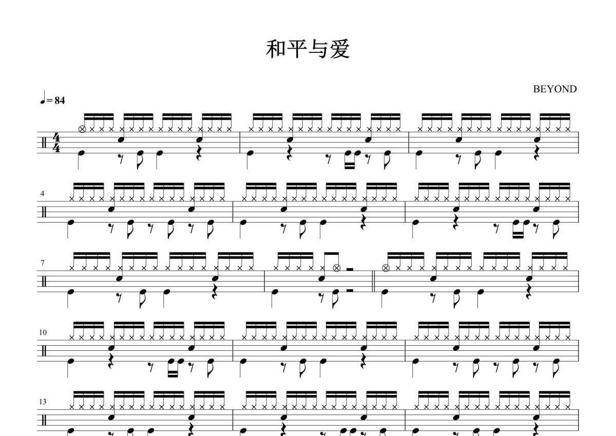 《和平与爱》是BEYOND演唱的一首歌曲,拍号为4/4拍,歌曲速度为每分钟84拍,这份鼓谱共有两张高清图谱,图谱由 @打鼓谱 编配上传,图谱使用五线谱编配,使用这份和平与爱架子鼓谱,你将能够轻松地敲打出这首BEYOND的和平与爱,快来尝试吧。《和平与爱》是中国香港摇滚乐队Beyond演唱的一首粤语歌曲,由黄家强作词,黄贯中作曲,Beyond、梁邦彦共同编曲 ,收录在Beyond1993年5月14日发行的粤语专辑《乐与怒》中。该曲的日语版名为《Never Change World》,由森浩美作词,收录于Beyond在1993年7月发行的日语专辑《This ls Love I》中。该曲是Beyond的一首关注第三世界的音乐作品,是Beyond一贯的呼吁,也是贯穿家驹一生的追求和理想。