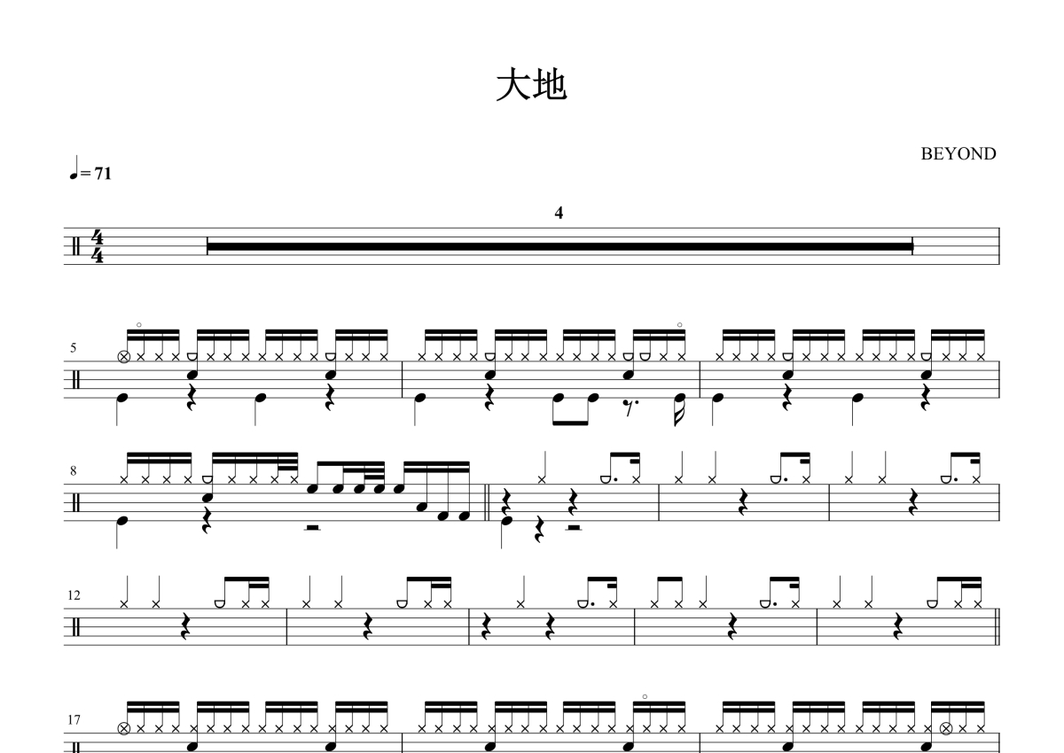 《大地》是BEYOND演唱的一首歌曲,拍号为4/4拍,歌曲速度为每分钟71拍,这份鼓谱共有三张高清图谱,图谱由 @打鼓谱 编配上传,图谱使用五线谱编配,使用这份大地架子鼓谱,你将能够轻松地敲打出这首BEYOND的大地,快来尝试吧。《大地》是中国香港摇滚乐队Beyond的一首歌曲,由刘卓辉作词,黄家驹作曲,Beyond、林培共同编曲,黄贯中演唱,粤语版收录在Beyond于1988年9月6日发行的粤语专辑《秘密警察》中 ,普通话版则收录在Beyond于1990年10月发行的普通话专辑《大地》中 。该曲粤语版获得1988年度十大劲歌金曲颁奖典礼“十大劲歌金曲奖”。