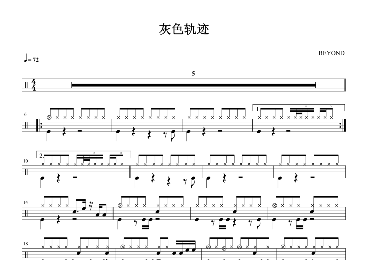 《灰色轨迹》是BEYOND演唱的一首歌曲,拍号为4/4拍,歌曲速度为每分钟72拍,这份鼓谱共有两张高清图谱,图谱由 @打鼓谱 编配上传,图谱使用五线谱编配,使用这份灰色轨迹架子鼓谱,你将能够轻松地敲打出这首BEYOND的灰色轨迹,快来尝试吧。《灰色轨迹》是中国香港摇滚乐队Beyond的一首音乐作品 (影视代表作),由刘卓辉作词,黄家驹作曲并演唱,Beyond编曲。该歌曲是1990年刘德华、吴倩莲主演的电影《天若有情》的插曲,最早收录在新艺宝唱片公司1990年6月发行的《天若有情》电影原声带中,后收录在Beyond1992年由新艺宝唱片公司发行的精选集《Contro[》中。2003年,为纪念Beyond成立二十周年与乐队成员黄家驹逝世十周年,Beyond将该歌曲重新编曲,以Back to Basics的原声音乐姿态重现。