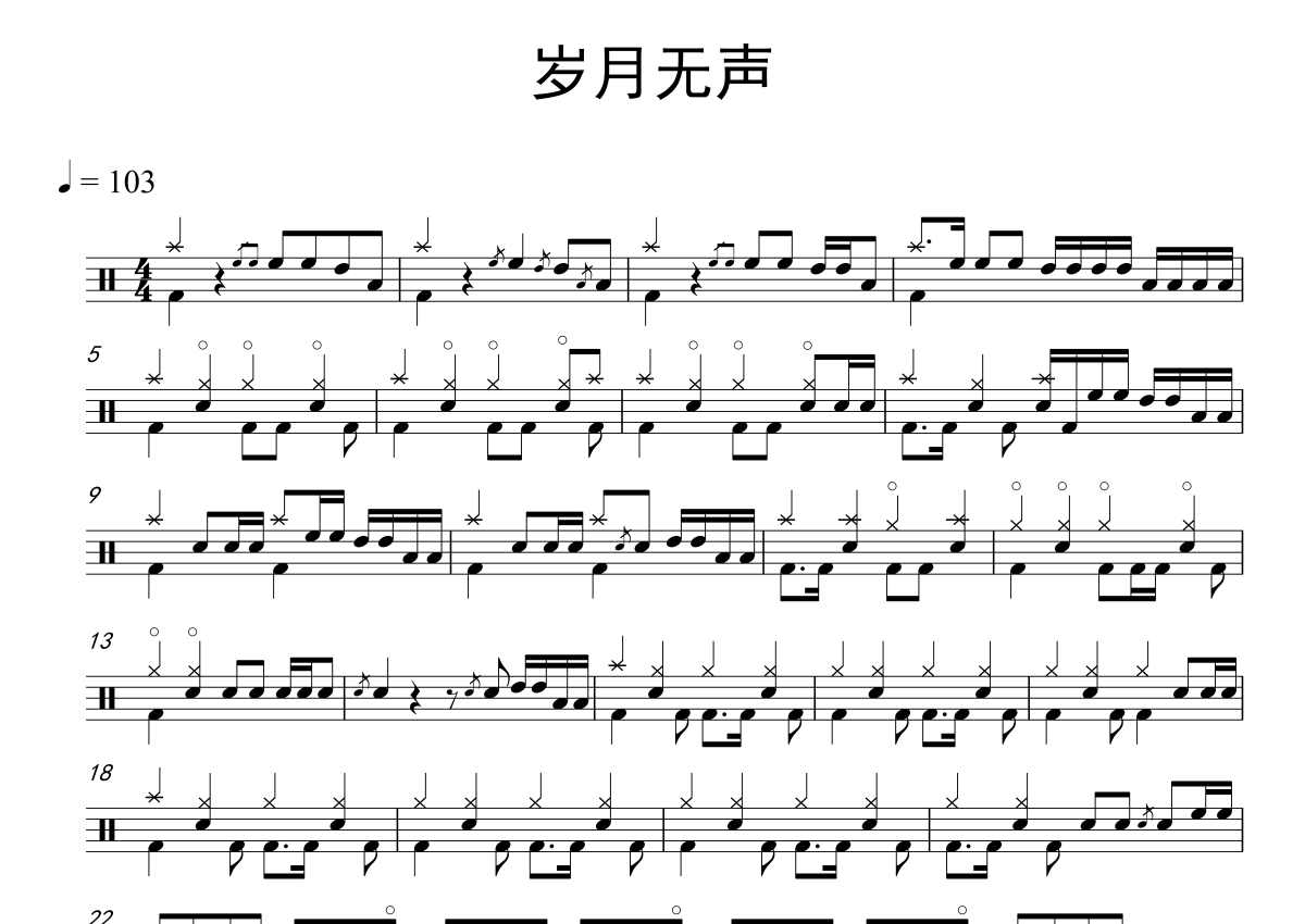 《岁月无声》是Beyond演唱的一首歌曲,拍号为4/4拍,歌曲速度为每分钟103拍,这份鼓谱共有两张高清图谱,图谱由 @打鼓谱 编配上传,图谱使用五线谱编配,使用这份岁月无声架子鼓谱,你将能够轻松地敲打出这首Beyond的岁月无声,快来尝试吧。Beyond是一支来自于中国香港的著名摇滚乐队 (共2页)培训机构和老师的福利,非常合适集体课教学和初学者自学使用,每天学会一首歌,本人也是架子鼓老师,一节课就能让学员轻松学会。