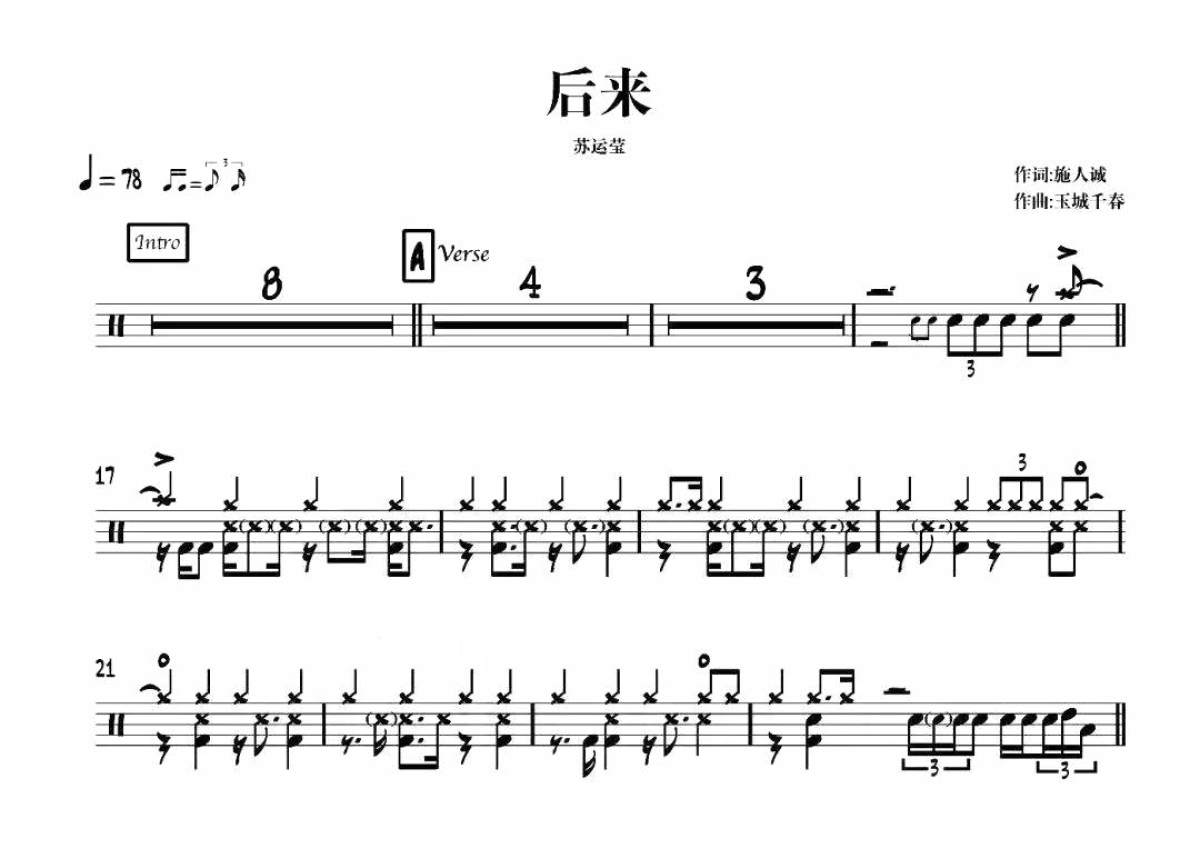《后来》是苏运莹演唱的一首歌曲,拍号为4/4拍,歌曲速度为每分钟78拍,这份鼓谱共有三张高清图谱,图谱由 @打鼓谱 编配上传,图谱使用五线谱编配,使用这份后来架子鼓谱,你将能够轻松地敲打出这首苏运莹的后来,快来尝试吧。《后来》是青春爱情大片《致青春·原来你还在这里》宣传曲,由华语乐坛鬼马精灵苏运莹倾情献唱。
