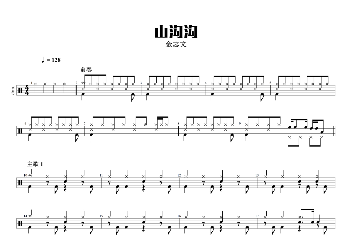 《山沟沟》是金志文演唱的一首歌曲,拍号为4/4拍,歌曲速度为每分钟128拍,这份鼓谱共有两张高清图谱,图谱由 @打鼓谱 编配上传,图谱使用五线谱编配,使用这份山沟沟架子鼓谱,你将能够轻松地敲打出这首金志文的山沟沟,快来尝试吧。专为初学者/儿童/青少年制作的简化版鼓谱,界面简介,非常适合教学使用。可为培训机构定制专属教案,喜欢的加收藏哦~。