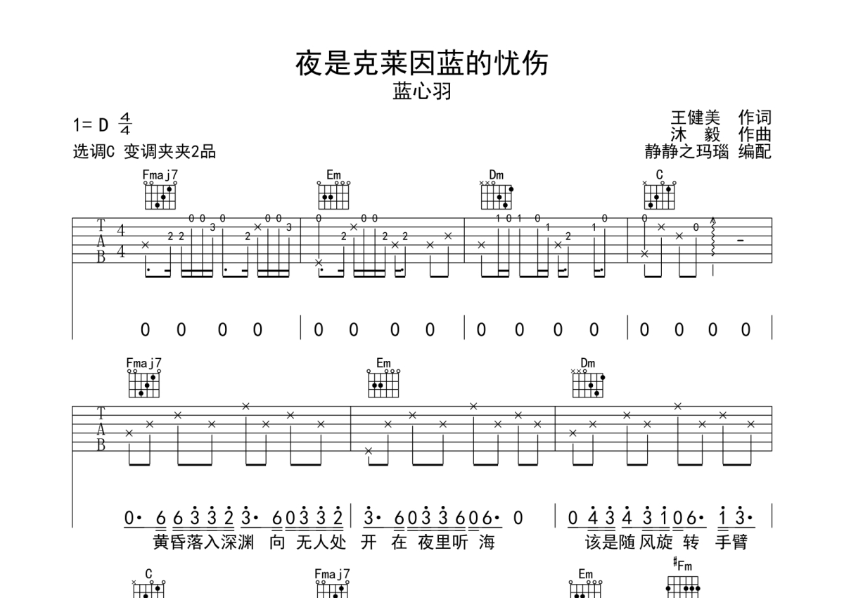 蓝心羽《夜是克莱因蓝的忧伤》吉他谱 - C调弹唱六线谱