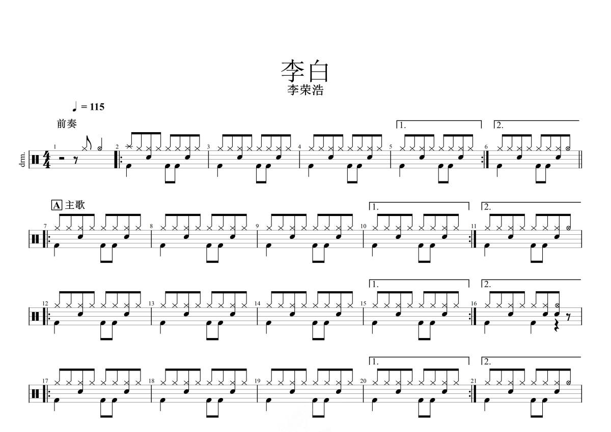 《李白》是李荣浩演唱的一首歌曲,简化版,拍号为4/4拍,歌曲速度为每分钟115拍,这份鼓谱共有两张高清图谱,图谱由 @打鼓谱 编配上传,图谱使用五线谱编配,使用这份李白架子鼓谱,你将能够轻松地敲打出这首李荣浩的李白,快来尝试吧。专为初学者/儿童/青少年制作的简化版鼓谱,界面简介,非常适合教学使用。可为培训机构定制专属教案,喜欢的加收藏哦~。