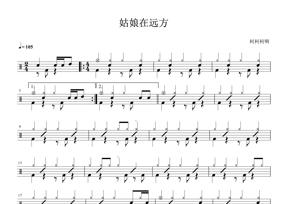 《姑娘在远方》是柯柯柯啊演唱的一首歌曲,拍号为4/4拍,歌曲速度为每分钟105拍,这份鼓谱共有三张高清图谱,图谱由 @打鼓谱 编配上传,图谱使用五线谱编配,使用这份姑娘在远方架子鼓谱,你将能够轻松地敲打出这首柯柯柯啊的姑娘在远方,快来尝试吧。《姑娘在远方》是一首中国流行歌曲,歌曲讲述了唱者怀念在远方的姑娘的心情。歌曲字里行间流露出的是一种深深的思念,歌词中所写的每一个细节都让人感受到了唱者对远方姑娘的留恋。 从歌词中我们还能感受到唱者对爱情的热望和渴求,而在姑娘的身上,唱者找到了对未来的希望。这首歌曲旋律简单而动听,深情的歌词和旋律结合在一起,处处流露出浓浓的思念之情,令人听了很容易被感动,想起远方的亲朋好友或是恋人,内心也会自然而然地涌动出深情的感慨。