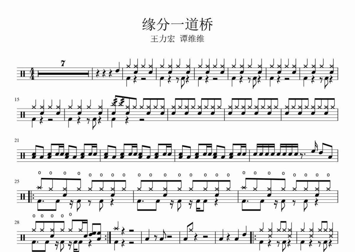 《缘分一道桥》是王力宏/谭维维演唱的一首歌曲,拍号为4/4拍,这份鼓谱共有一张高清图谱,图谱由 @打鼓谱 编配上传,图谱使用五线谱编配,使用这份缘分一道桥架子鼓谱,你将能够轻松地敲打出这首王力宏/谭维维的缘分一道桥,快来尝试吧。缘分一道桥 是王力宏、谭维维合唱的一首歌曲,由方文山作词,王力宏作曲,Tat Tong编曲。该曲是张艺谋执导电影《长城》的片尾曲,于2016年11月15日首发,16日全网上线,后收录在王力宏2017年12月11日发行的专辑《A.I. 爱》中。歌曲背景由张艺谋执导,集结了马特·达蒙、威廉·达福及刘德华、张涵予、景甜等中外巨星的电影《长城》将登陆2017年贺岁档,阵容豪华题材爆款自然未映先热,举足轻重的电影配乐和主题曲的演唱者也是备受瞩...。