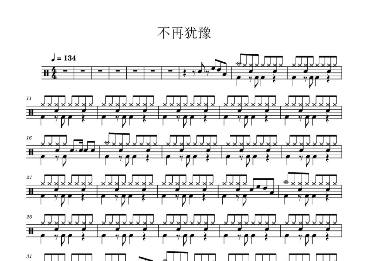 《不再犹豫》是Beyond乐队演唱的一首歌曲,拍号为4/4拍,歌曲速度为每分钟134拍,这份鼓谱共有三张高清图谱,图谱由 @打鼓谱 编配上传,图谱使用五线谱编配,使用这份不再犹豫架子鼓谱,你将能够轻松地敲打出这首Beyond乐队的不再犹豫,快来尝试吧。Beyond乐队最经典曲目之一《不再犹豫》是电影《Beyond日记之莫欺少年穷》中的主题曲。该曲由梁美薇填词,黄家驹谱曲,Beyond乐队演唱,并被收录于1991年发行的专辑《犹豫》内。