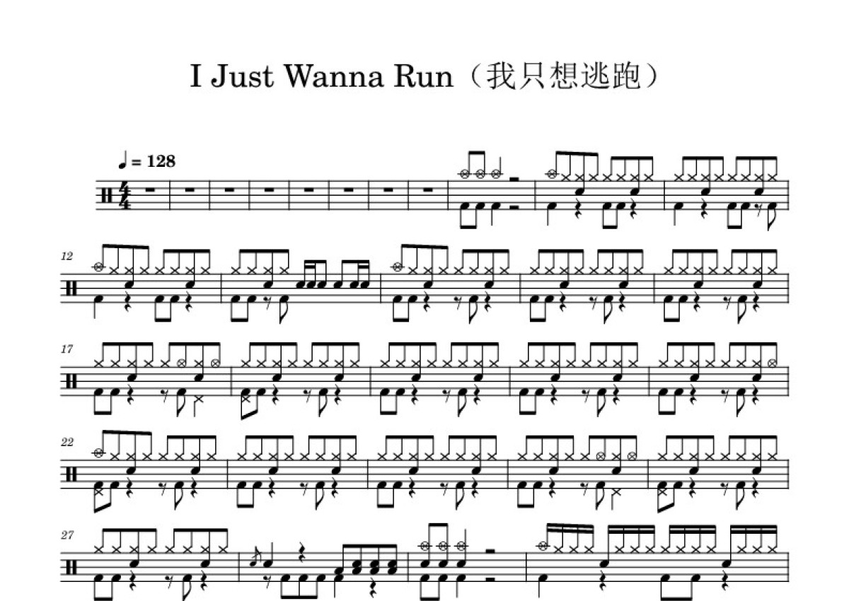《I just wanna run the downtown》是the downtown fiction乐团演唱的一首歌曲,拍号为4/4拍,歌曲速度为每分钟128拍,这份鼓谱共有三张高清图谱,图谱由 @打鼓谱 编配上传,图谱使用五线谱编配,使用这份I just wanna run the downtown架子鼓谱,你将能够轻松地敲打出这首the downtown fiction乐团的I just wanna run the downtown,快来尝试吧。经典英文摇滚,适合少儿学习演出使用《I just wanna run》是the downtown fiction乐团首发于Best I Never Had专辑中的一首摇滚乐曲。并被选做"实况足球2011 ","新浪nba"背景音乐。