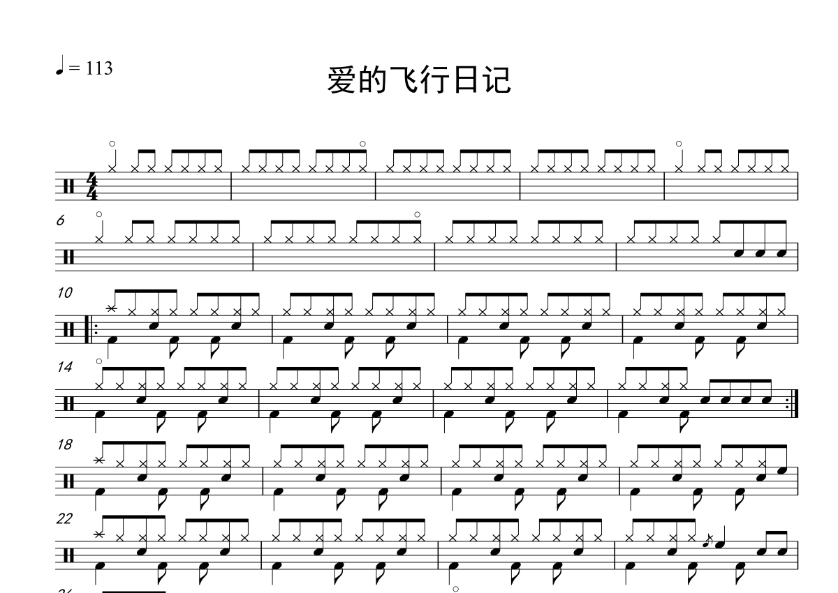 《爱的飞行日记》是周杰伦/杨瑞代演唱的一首歌曲,拍号为4/4拍,这份鼓谱共有两张高清图谱,图谱由 @打鼓谱 编配上传,图谱使用五线谱编配,使用这份爱的飞行日记架子鼓谱,你将能够轻松地敲打出这首周杰伦/杨瑞代的爱的飞行日记,快来尝试吧。(共2页)培训机构和老师的福利,非常合适集体课教学和初学者自学使用,每天学会一首歌,本人也是架子鼓老师,一节课就能让学员轻松学会。 《爱的飞行日记》是由周杰伦、杨瑞代合唱的一首歌曲,由方文山填词,周杰伦作曲,蔡科俊编曲,收录在周杰伦2010年5月18日发行的专辑《跨时代》中。
