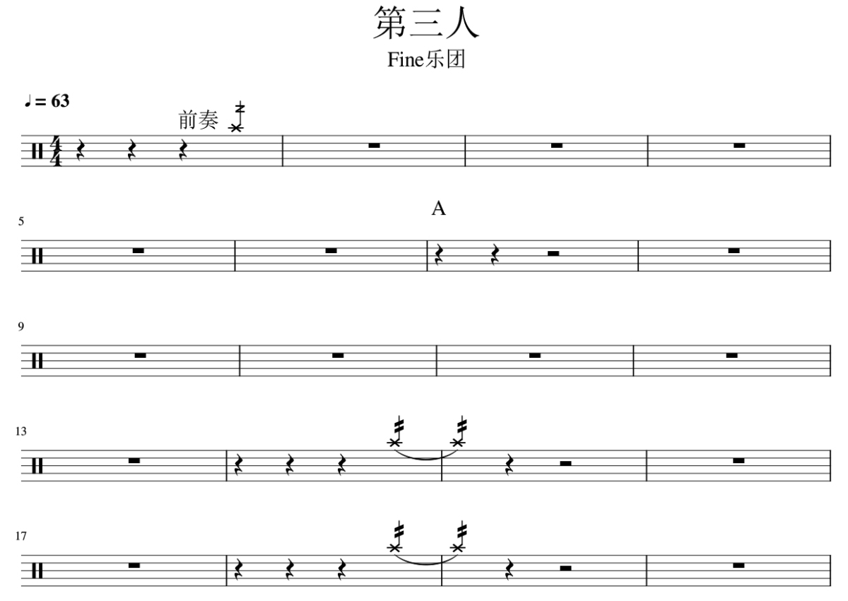 《第三人》是Fine乐团演唱的一首歌曲,拍号为4/4拍,歌曲速度为每分钟63拍,这份鼓谱共有两张高清图谱,图谱由 @打鼓谱 编配上传,图谱使用五线谱编配,使用这份第三人架子鼓谱,你将能够轻松地敲打出这首Fine乐团的第三人,快来尝试吧。Fine乐团演唱,收录于《天花板》专辑。