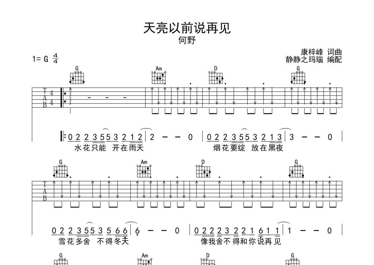 何野《天亮以前说再见》吉他谱 - G调弹唱六线谱