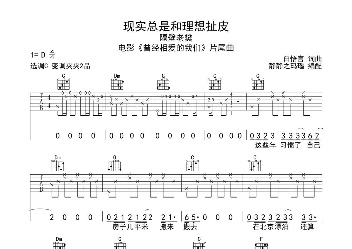 隔壁老樊《现实总是和理想扯皮》吉他谱 - C调弹唱六线谱