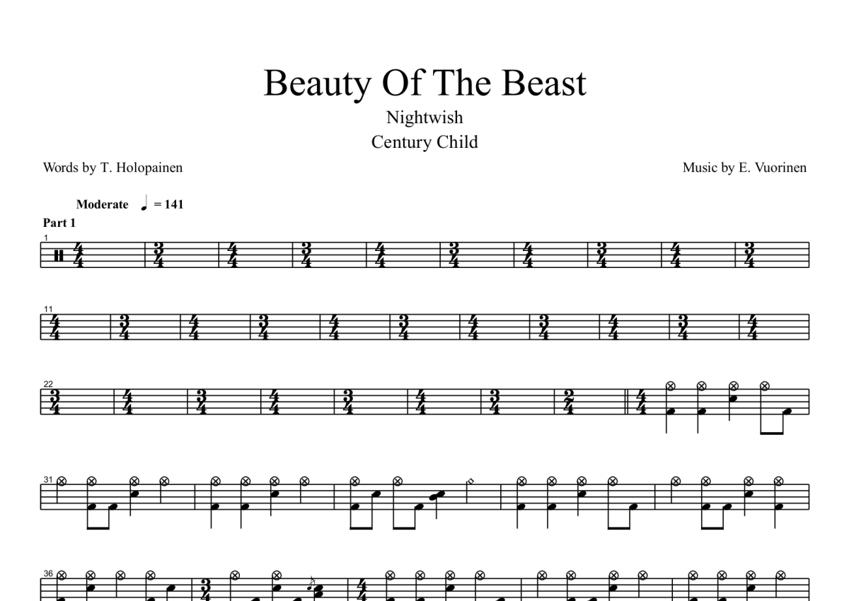 Nightwish夜愿《Beauty Of The Beast》鼓谱 - 架子鼓谱