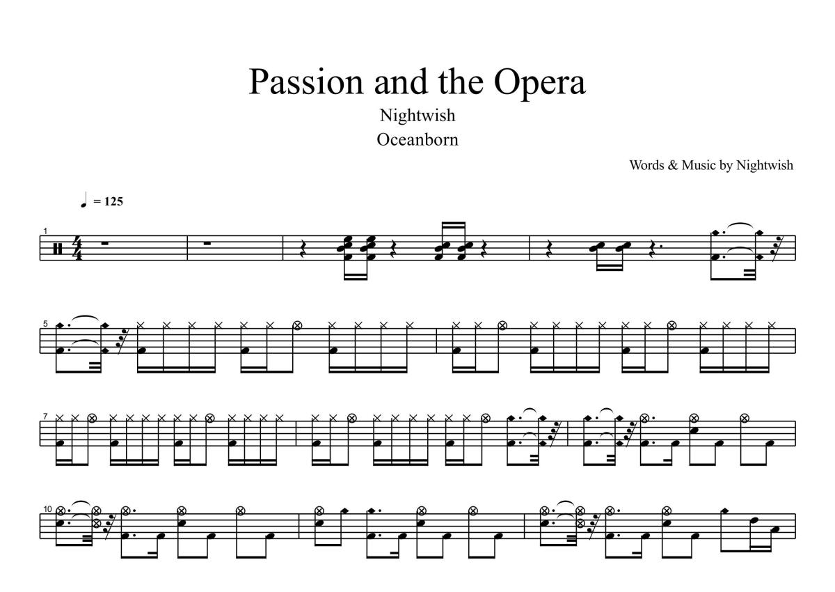 《Passion And The Opera》是夜愿演唱的一首歌曲,拍号为4/4拍,歌曲速度为每分钟125拍,这份鼓谱共有五张高清图谱,图谱由 @打鼓谱 编配上传,图谱使用五线谱编配,使用这份Passion And The Opera架子鼓谱,你将能够轻松地敲打出这首夜愿的Passion And The Opera,快来尝试吧。《Passion And The Opera》是Nightwish演唱的歌曲,收录于《Oceanborn》专辑中。
