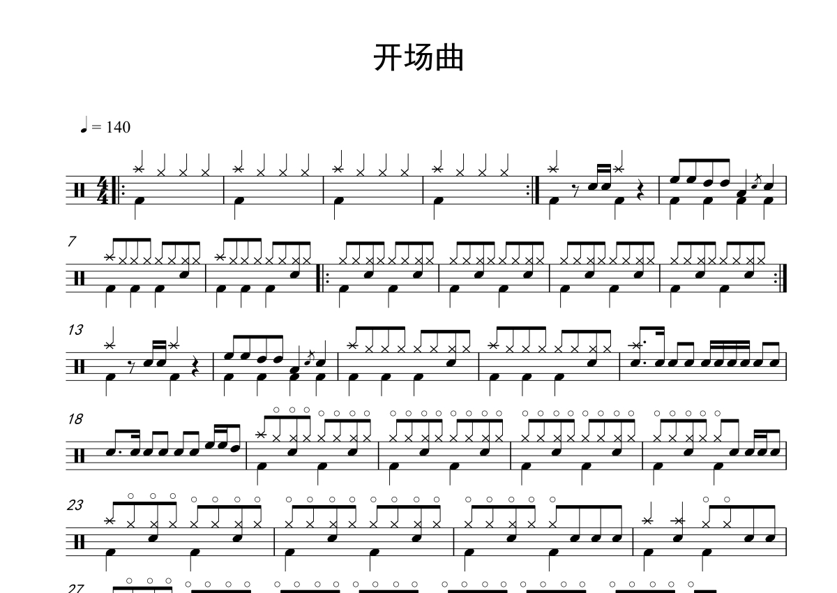 《开场曲》,拍号为4/4拍,歌曲速度为每分钟140拍,这份鼓谱共有两张高清图谱,图谱由 @打鼓谱 编配上传,图谱使用五线谱编配,使用这份开场曲架子鼓谱,你将能够轻松地敲打出这首开场曲,快来尝试吧。