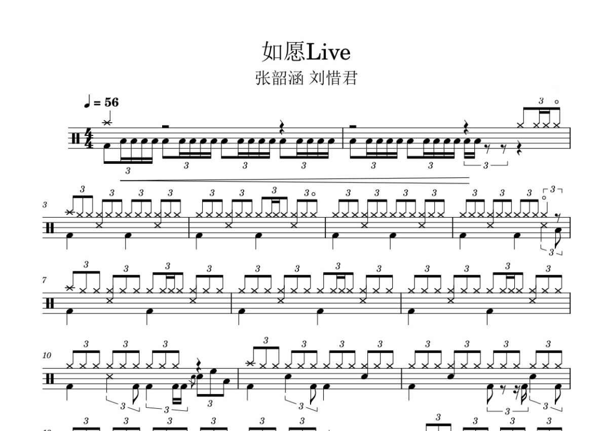 张韶涵/刘惜君《如愿》鼓谱 - 架子鼓谱 - 天赐的声音Live