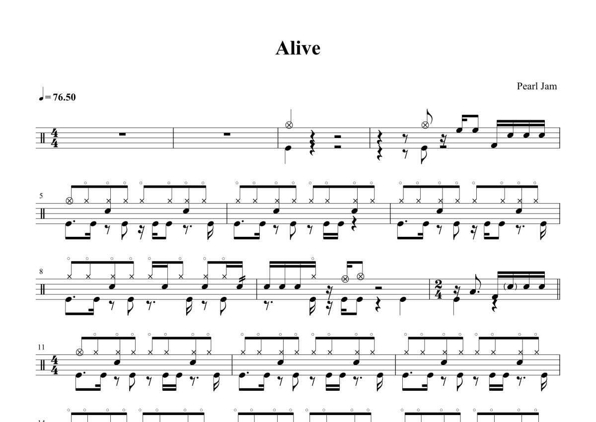 《Alive》是Blue演唱的一首歌曲,拍号为4/4拍,歌曲速度为每分钟76拍,这份鼓谱共有四张高清图谱,图谱由 @打鼓谱 编配上传,图谱使用五线谱编配,使用这份Alive架子鼓谱,你将能够轻松地敲打出这首Blue的Alive,快来尝试吧。歌曲名:《Alive》 原版原唱:Blue。
